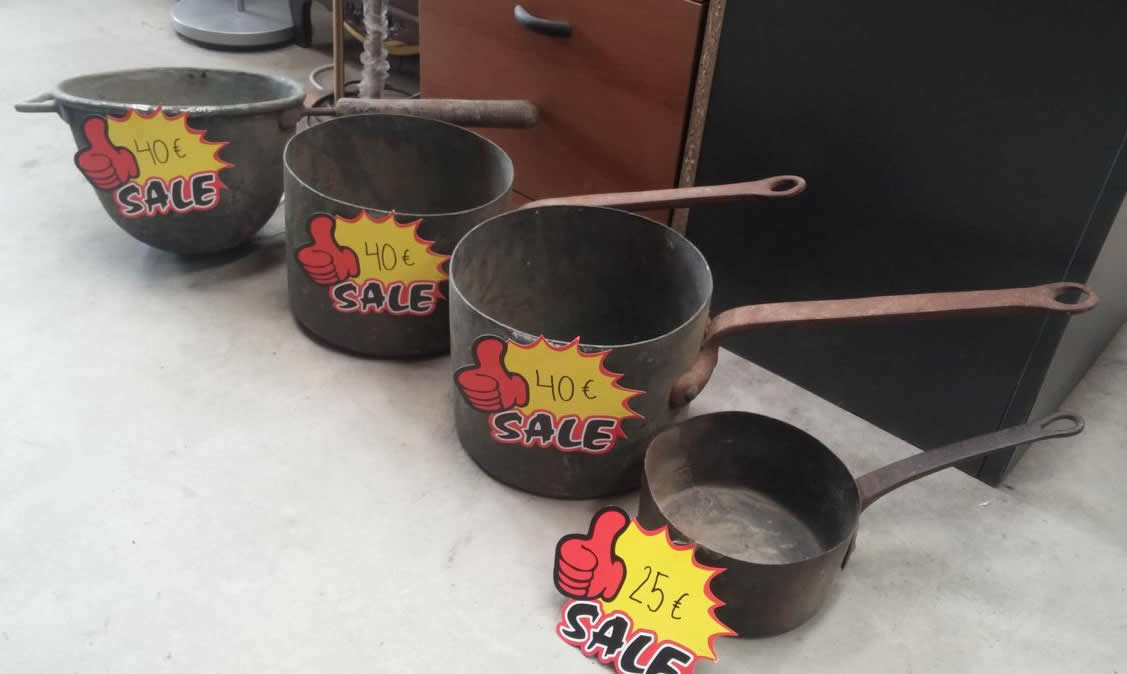 Cazuelas, 4 cazuelas de cobre diferentes tamaños, a partir de 25€ la pequeña, las mas grandes 40€ cada una.